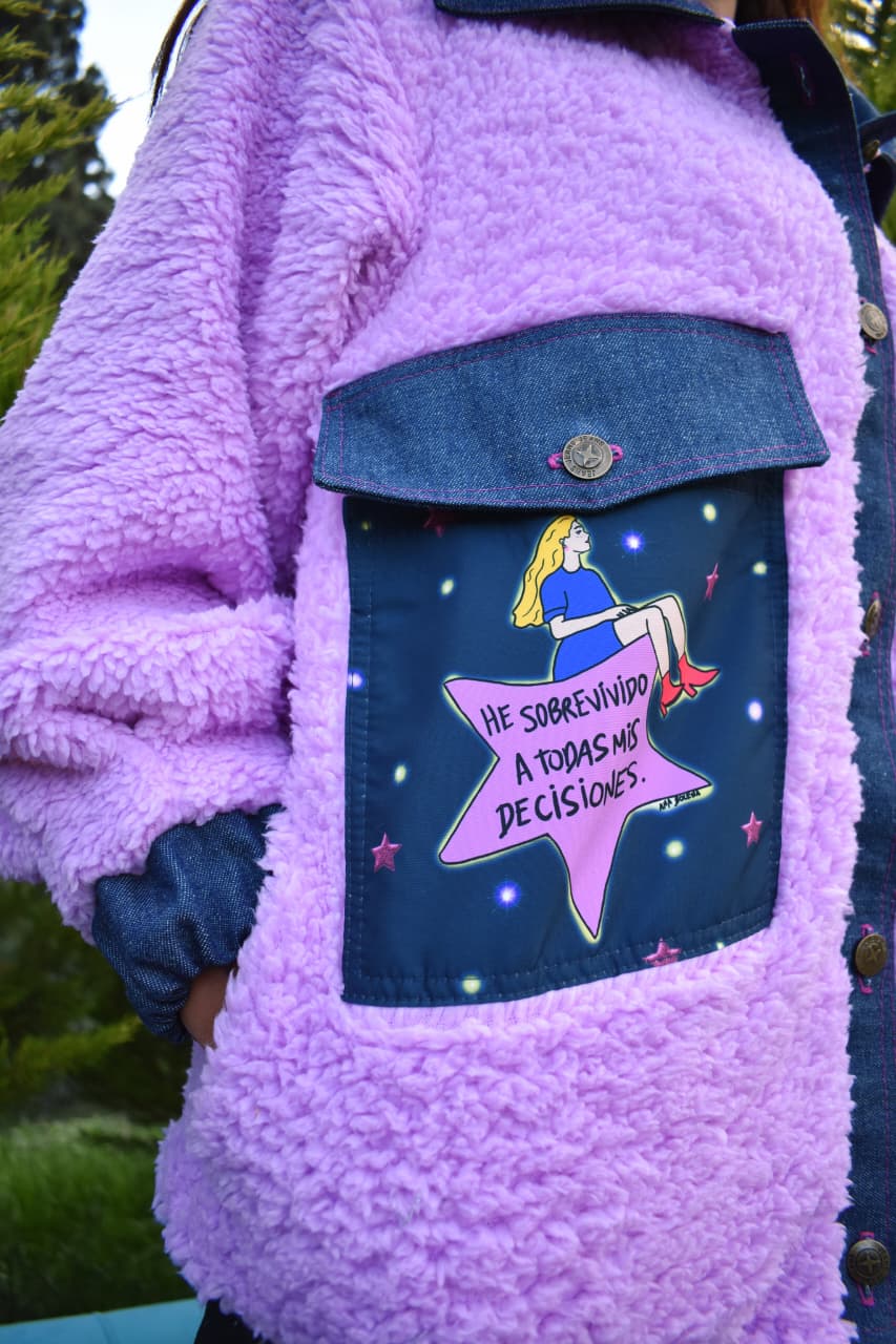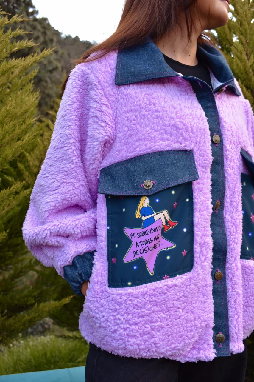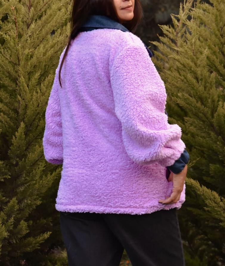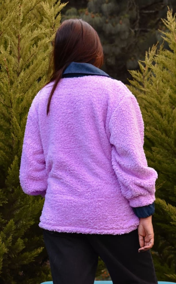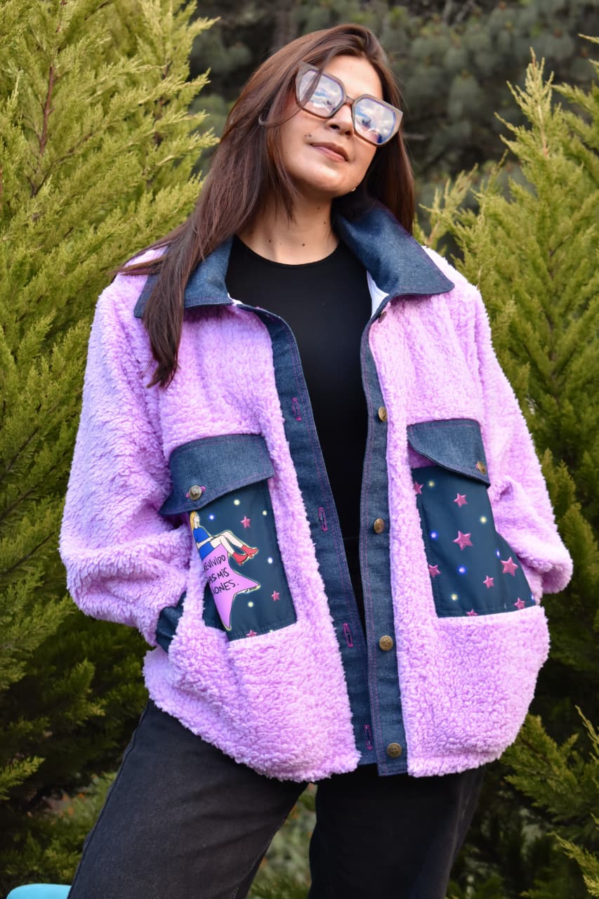 - Bomber elaborada en tela afelpada, con detalles en jean oscuro, tiene bolsillos laterales y es forrada por la parte interna.