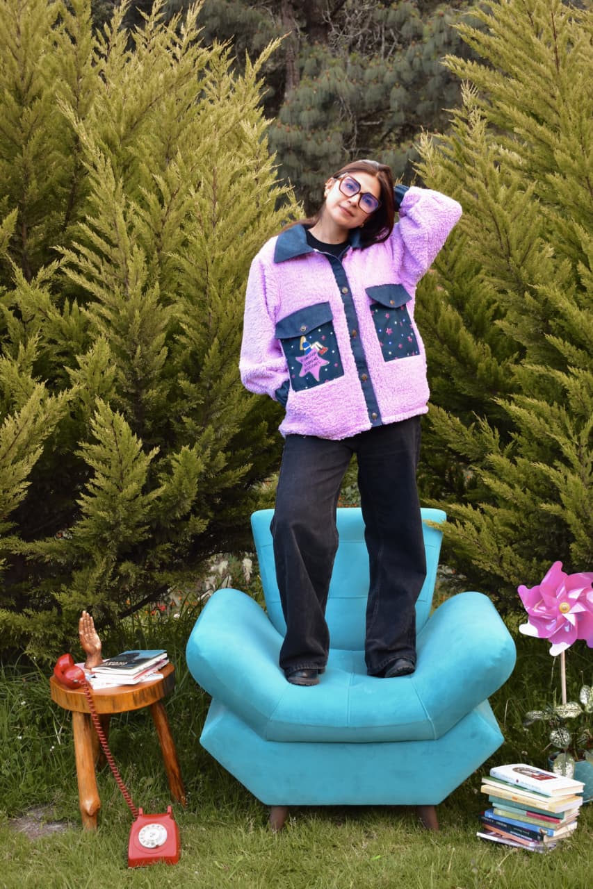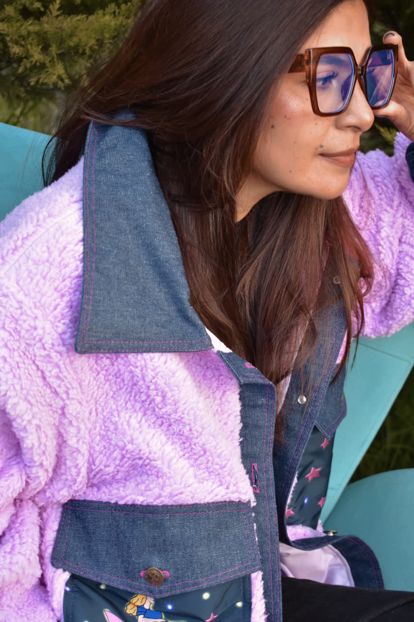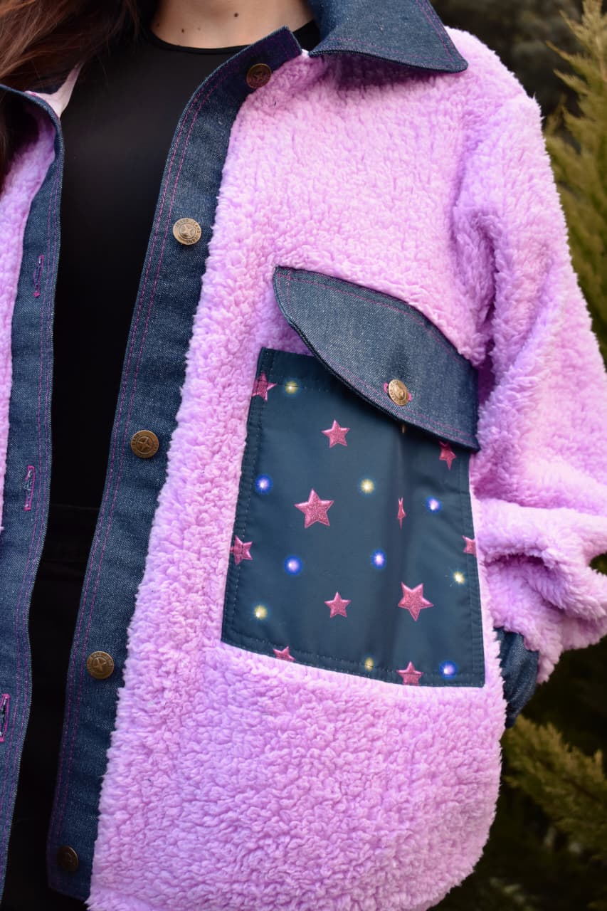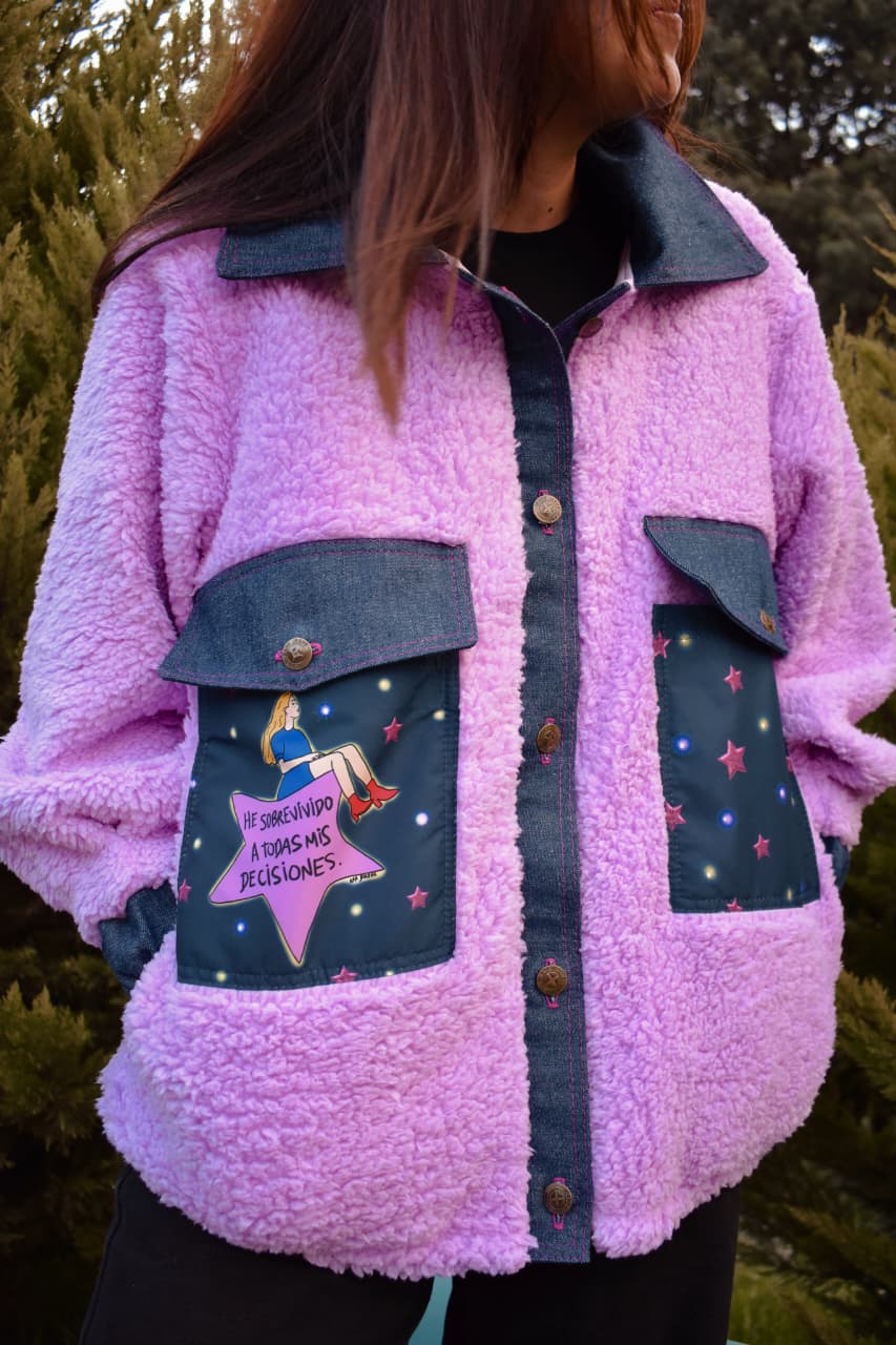 - Bomber elaborada en tela afelpada, con detalles en jean oscuro, tiene bolsillos laterales y es forrada por la parte interna.