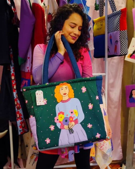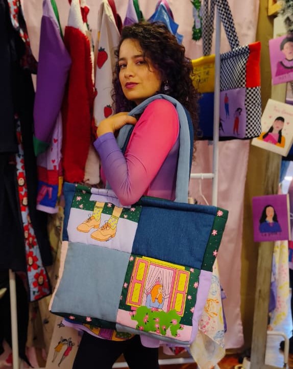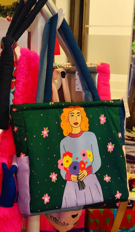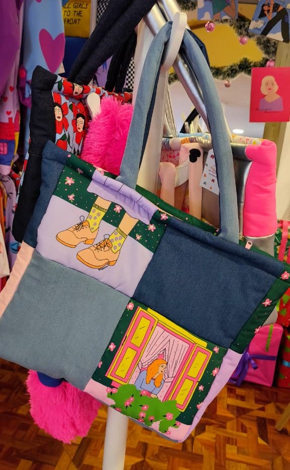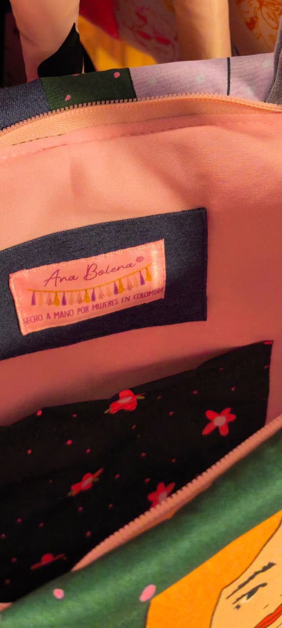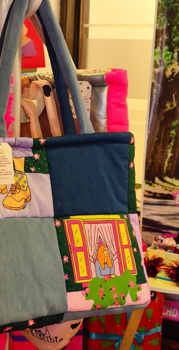Tote bag acolchado elaborado en tela impermeable con detalles en jean, con cierre y bolsillo interno.